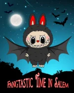 Batty Labubu Monster is having a Fangtastic time in Salem – share this fun, monster great time with those you love or keep it for yourself – great for junk journals – kids to share their travels – a fun postcard to frame and hang as art – have a Fangtastic time with this little monster.